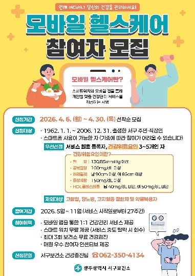 한방통신사 김성의 기자 | 광주광역시 서구가 지역주민의 건강관리 역량 강화를 위해 정보통신기술(ICT)을 활용한 건강관리 서비스 ‘모바일 헬스케어’ 참여자 125명을 오는 30일까지 선착순 모집한다.