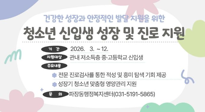 사업기간은 2026년 3월부터 10월까지이며 참여를 희망하는 가구는 파장동 행정복지센터를 방문해 신청할 수 있다. 자세한 사항은 파장동 건강복지팀으로 문의하면 안내받을 수 있다.