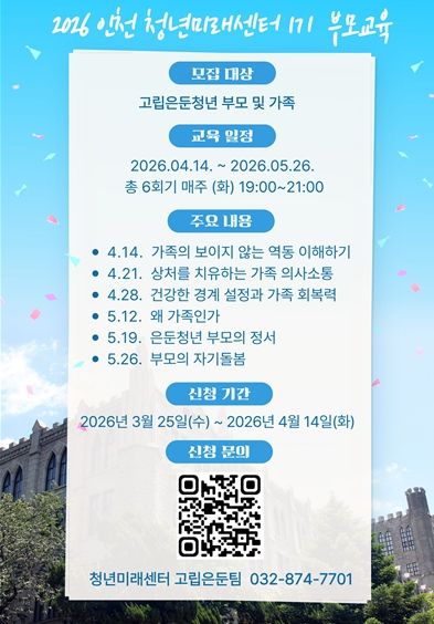 한방통신사 신유철기자 기자 | 인천시사회서비스원 소속 인천시청년미래센터는 올해 첫 고립은둔청년 부모·가족 교육을 준비하고 참여자를 모집한다고 7일 밝혔다.