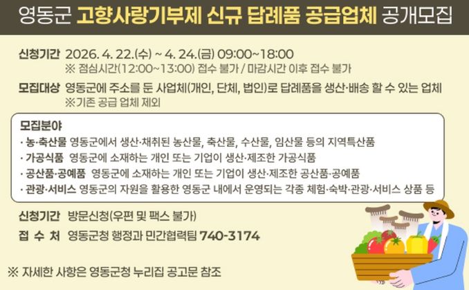 한방통신사 권영분기자 기자 | 충북 영동군이 2026년도 고향사랑기부제 신규 답례품 공급업체를 모집한다고 8일 밝혔다.