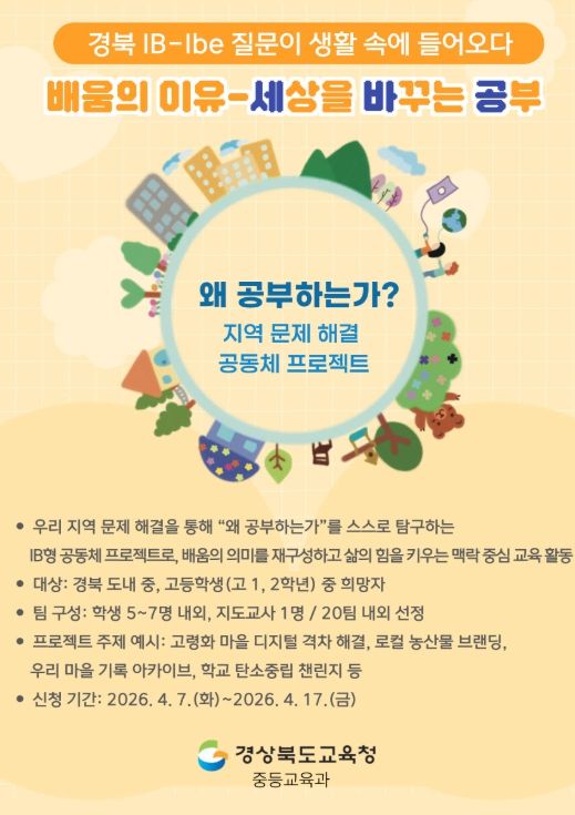 한방통신사 신유철기자 기자 | 경북교육청은 학생들이 스스로 질문하고 삶과 연결된 배움을 실천하는 교육을 위해 ‘배움의 이유–세바공(세상을 바꾸는 공부)’ 프로그램을 운영하고, 오는 17일까지 참여 학생을 모집한다고 밝혔다.