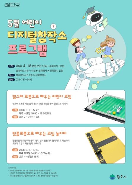 5월 2일부터 27일까지 ▲햄스터 로봇을 직접 움직이며 코딩 개념을 놀이 중심으로 익히는 ‘햄스터 로봇으로 배우는 어린이 코딩(초등 2·3학년)’ ▲핑퐁로봇의 조립부터 동작 제어까지 학습하며 로봇과 코딩의 기본 원리를 체득하는 ‘핑퐁로봇으로 배우는 코딩 놀이터(초등 4∼6학년)’ 등 2개 강좌가 각 4회차씩 진행된다.