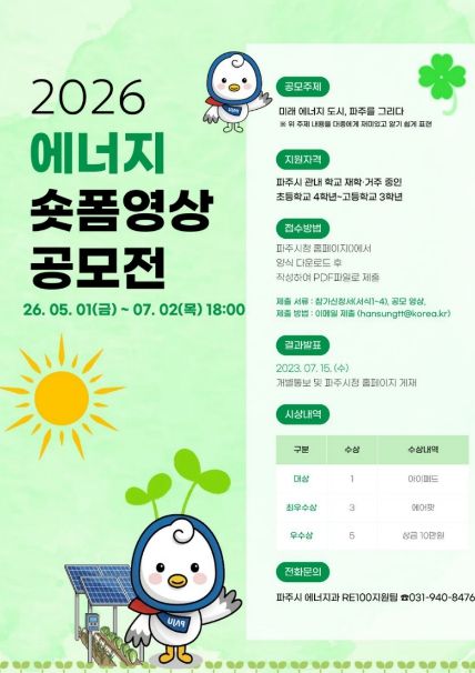 한방통신사 신유철기자 기자 | 파주시는 청소년들의 에너지 인식을 제고하고 디지털 미디어 활용 역량을 강화하기 위해 녪년 파주시 청소년 에너지 숏폼 영상 공모전’을 개최한다.