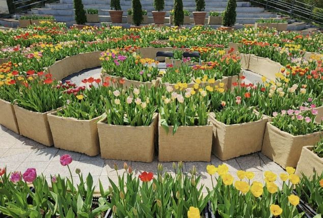 이번 화단은 튤립 구근을 상자 식재 방식으로 심은 튤립상자를 활용해 원형 동선을 따라 미로처럼 걸을 수 있도록 조성한 것이 특징이다. 방문객들은 미로 길을 따라 이동하며 꽃을 가까이에서 감상할 수 있고, 여러 색의 튤립이 어우러진 화단에서 한층 화려하고 풍성한 봄 풍경을 즐길 수 있다.