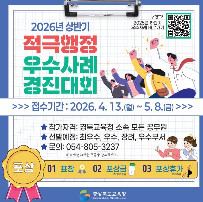 한방통신사 신유철기자 기자 | 경북교육청은 능동적이고 창의적인 공직문화를 조성하고 교육 현장의 변화를 이끈 우수 사례를 발굴하기 위해 ‘2026년 상반기 적극행정 우수 사례 경진대회’를 개최한다고 15일 밝혔다.