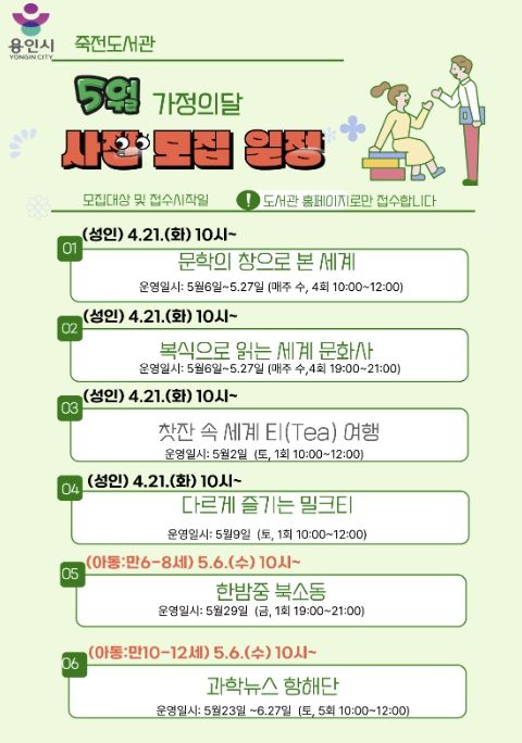 한방통신사 신유철기자 기자 | 용인특례시 죽전도서관은 오는 5월 가정의 달을 맞아 ‘2026년 5월 독서문화행사’를 개최한다.