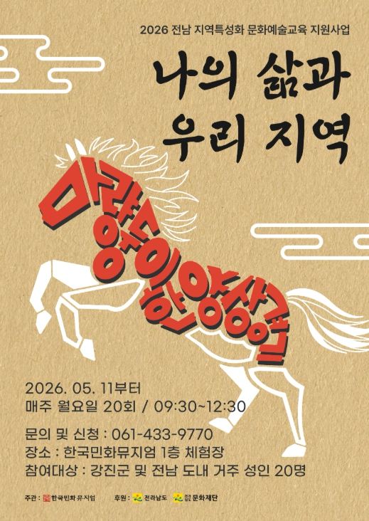 한방통신사 신다은기자 기자 | 강진군 대구면에 있는 한국민화뮤지엄이 ‘2026 지역특성화 문화예술교육 지원사업’ 선정에 따라 오는 5월 11일부터 ‘나의 삶과 우리 지역–마량둥이의 한양 상경기’ 프로그램 운영을 시작하며 참가자를 모집한다.