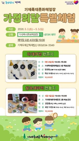 체험은 행사 기간 동안 1일 2회(오후 1시~3시) 운영되며, 회차당 20명까지 1일 최대 40명 참여할 수 있다. 참가자는 다양한 재료를 활용해 자신만의 개성이 담긴 작품을 완성하게 되며, 재료비는 16,000원이다. 체험은 거제목재문화체험장 2층 해송공방에서 진행된다.