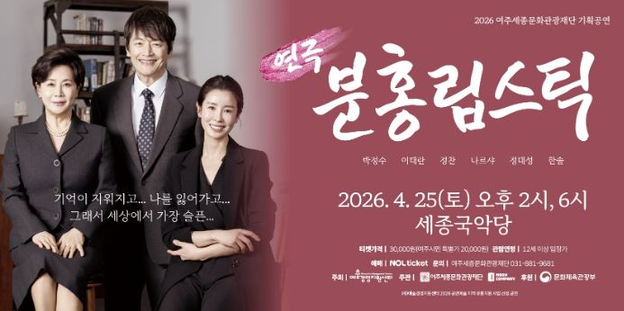 한방통신사 신유철기자 기자 | 여주세종문화관광재단이 오는 4월 25일, 예술경영지원센터의 공모사업인 '공연예술 지역 유통지원 사업'의 일환으로 베테랑 배우들이 참여한 창작 연극‘분홍립스틱’을 세종국악당에서 개최한다.