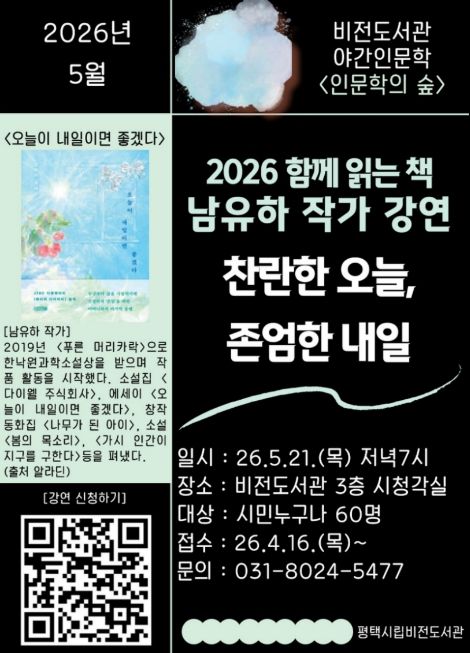 한방통신사 신유철기자 기자 | 평택시립 비전도서관은 오는 5월 21일 저녁 7시 남유하 작가를 초청하여 ‘찬란한 오늘, 존엄한 내일’을 주제로 야간 인문학 강연을 진행한다.