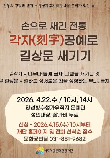 한방통신사 신유철기자 기자 | 여주세종문화관광재단은 오는 4월 22일, 명성황후기념관 4월 문화가 있는 날 프로그램으로 '손으로 새긴 전통, 각자(刻字)공예로 길상문 새기기'를 진행한다.