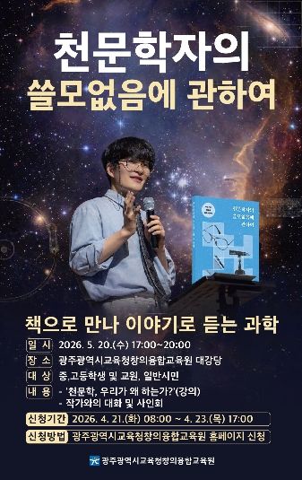한방통신사 김성의 기자 | 광주시교육청창의융합교육원은 오는 5월 20일 오후 5시 본원 대강당에서 유튜버 ‘우주먼지’ 지웅배 교수 초청 과학 특강을 운영한다.