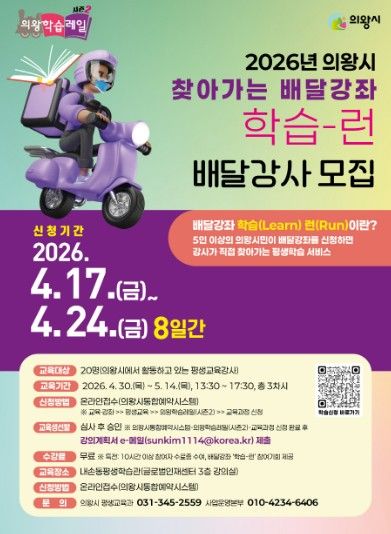 김성제 의왕시장은 “찾아가는 배달강좌 학습-런(Run)은 시민의 일상 속으로 직접 찾아가는 의왕시의 중요한 평생학습 사업”이라며 “이번 모집이 지역 내 다양한 재능을 가진 분들이 강사로 성장하게 되는 좋은 계기가 되길 바라며, 역량 있는 시민들의 많은 관심과 참여를 바란다”고 밝혔다.