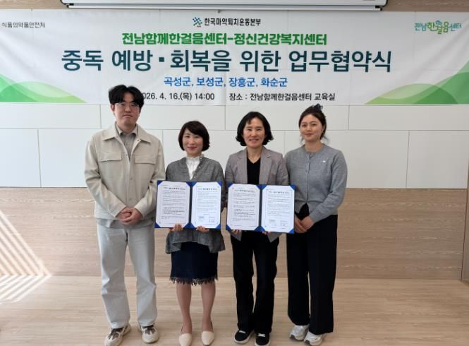 한방통신사 신다은기자 기자 | 화순군은 지난 16일 화순군정신건강복지센터가 전남함께한걸음센터와 지역사회 마약류 및 약물 오남용 예방과 회복 지원 강화를 위한 업무협약(MOU)을 체결했다고 밝혔다.