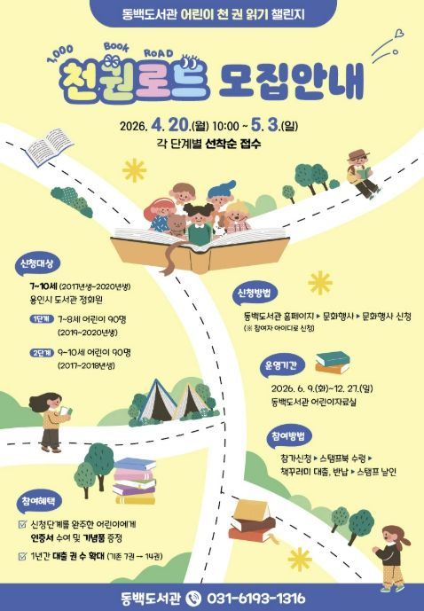 한방통신사 신유철기자 기자 | 용인특례시 동백도서관은 어린이 천 권 읽기 챌린지 ‘천권로드(ROAD)’ 참여자를 모집한다고 20일 밝혔다.