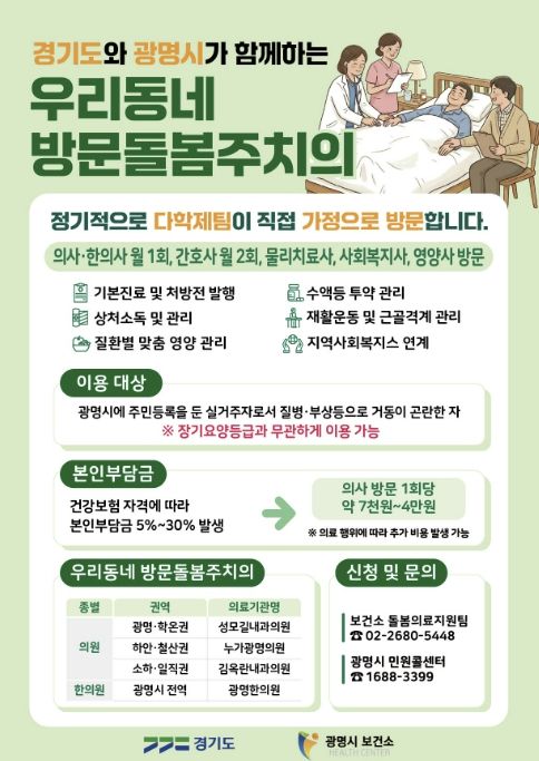 한방통신사 신유철기자 기자 | 장기요양등급이 없는 광명시민도 집에서 방문돌봄주치의 진료를 받을 수 있게 된다.