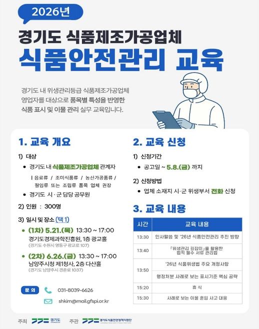 한방통신사 신유철기자 기자 | 경기도는 도내 식품제조·가공업체의 자율적 위생관리 역량을 강화하기 위해 ‘도내 식품제조·가공업체 위생관리 교육’ 참여자를 모집한다고 20일 밝혔다.