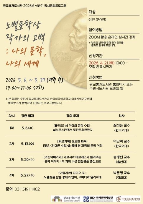 한방통신사 신유철기자 기자 | 수원시 광교홍재도서관이 한국외국어대학교와 협력해 진행하는 2026년 세계문화기행 시리즈 1편 ‘노벨문학상 작가의 고백 : 나의 문학, 나의 세계’ 강좌를 수강할 시민을 모집한다.