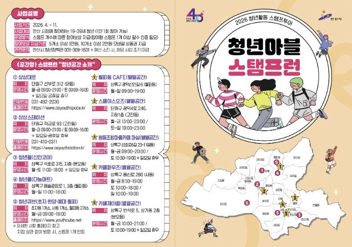 한편 ‘청년마블 스탬프런’ 사업에 대한 자세한 사항은 안산시청 누리집에서 확인할 수 있으며, 스탬프북은 관내 청년공간과 각종 청년 행사·축제 현장에서 받을 수 있다.