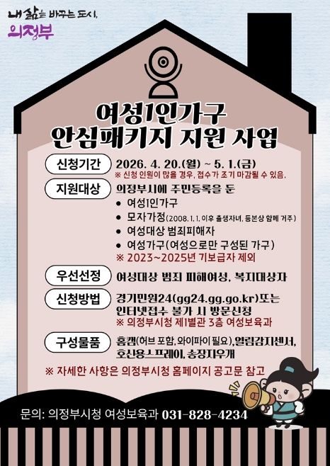 한방통신사 신유철기자 기자 | 의정부시는 4월 20일부터 5월 1일까지 12일간 온․오프라인을 통해 여성 1인 가구 안심패키지 지원사업의 신청을 접수한다.