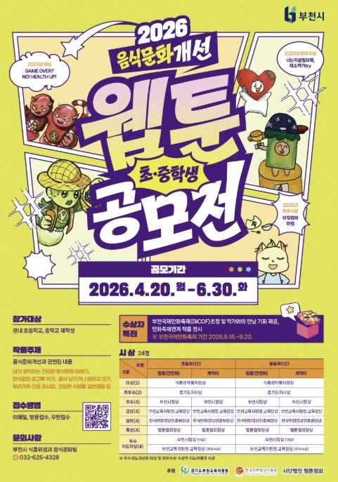 한방통신사 신유철기자 기자 | 부천시는 4월 20일부터 6월 30일까지 ‘2026년 음식문화개선 초중학생 웹툰·캐릭터 공모전’을 연다. 이번 공모전은 학생들이 일상 속 음식문화를 주제로 직접 창작에 참여함으로써 올바른 식문화에 대한 인식을 높이기 위해 매년 추진되고 있다.