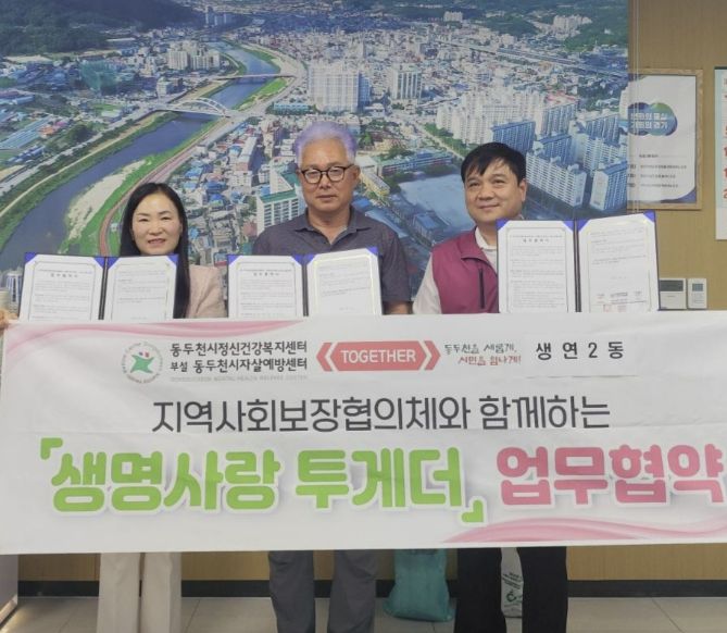 한방통신사 신유철기자 기자 | 동두천시정신건강복지센터 부설 자살예방센터는 ‘생명사랑 투게더’사업 추진을 위해 지난 17일, 생연2동 행정복지센터 및 생연2동 지역사회보장협의체와 업무협약을 체결했다.