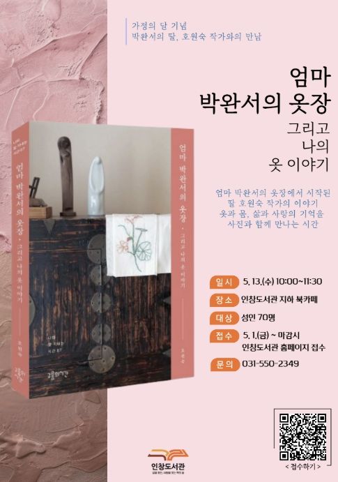 한방통신사 신유철기자 기자 | 구리시립도서관은 '호원숙 작가와의 만남 ‘엄마 박완서의 옷장, 그리고 나의 이야기’' 참여 신청을 오는 5월 1일부터 접수한다고 밝혔다.