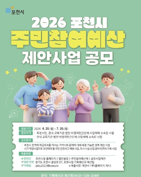 한편, 주민참여예산 공모를 통해 제안된 사업은 사업부서의 검토와 포천시 주민참여예산위원회의 심사를 거쳐 2027년도 예산에 편성될 예정이다.