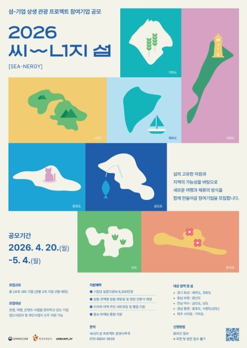 한방통신사 신유철기자 기자 | 문화체육관광부가 주최하고 한국관광공사가 주관한 2026년 씨너지『섬-기업 상생 관광프로젝트』 참여기업 공모를 오는 4월 20일 월요일 부터 5월 4일 월요일까지 모집한다.