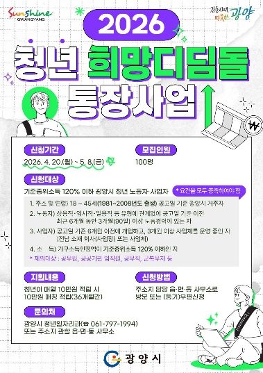 한방통신사 신다은기자 기자 | 광양시는 전라남도와 함께 청년의 자산 형성과 미래 준비를 지원하기 위해 ‘2026년 청년 희망디딤돌 통장사업’ 참여자를 모집한다고 밝혔다.
