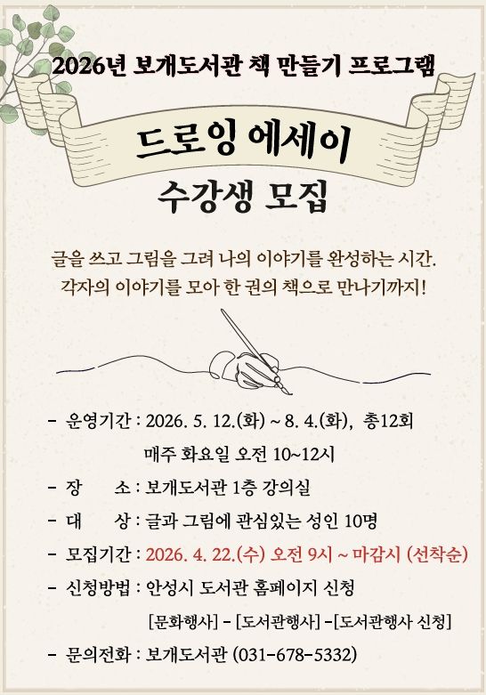 한방통신사 신유철기자 기자 | 안성시 보개도서관(책문화센터)이 시민들의 창작 활동을 지원하고 일상 속 예술 경험을 확대하기 위해 오는 5월부터 ‘드로잉 에세이’와 ‘포토 에세이’ 책 만들기 프로그램을 새롭게 운영한다고 밝혔다.