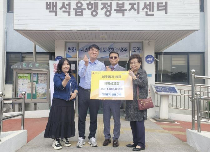 한방통신사 신유철기자 기자 | 양주시 백석읍은 지난 17일 생명샘교회가 지역 내 어려운 이웃을 돕기 위한 성금 100만 원을 기탁했다고 밝혔다.
