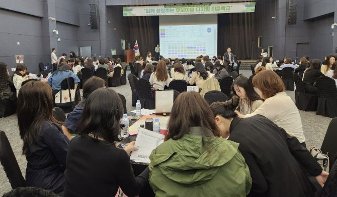 이날 워크숍의 백미는 참여 교원들이 소그룹으로 나누어 자유롭게 의견을 교환한 ‘월드카페’세션이었다. 22개 시범교 교원들은 ▲Topic1. 디지털 공간의 마법: 디지털 환경 구축 및 기기 관리 노하우 ▲Topic2. 유아 디지털 놀이의 발견: 유아 중심 디지털 교육과정 운영 사례 ▲Topic3. 교사 공동성장의 기록: 교사 공동체 운영 및 역량 강화 전략 ▲Topic4. 기관-가정 소통의 가교: 학부모 인식 개선 및 연계 방법 등 4가지 주제에 따라 생생한 현장의 목소리를 공유했다. 교원들은 각 테이블을 이동하며 디지털 공간 구축부터 학부모 소통법까지 실질적인 운영 팁을 주고 받으며 유치원과 어린이집 간의 상호 이해를 높였다.