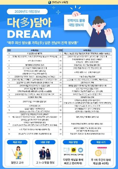 한방통신사 김성의 기자 | 전라남도교육청이 급변하는 대입 환경에 선제적으로 대응하고 학교 현장의 진학지도 역량을 강화하기 위해 맞춤형 대입 정보지 ‘다(多)담아 DREAM’을 발간·운영한다.