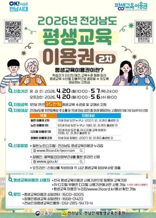 한방통신사 신다은기자 기자 | 순천시는 시민의 평생학습 기회 확대와 교육격차 해소를 위해 ‘2026년 전라남도 평생교육이용권’ 2차 신청 접수를 20일부터 시작한다고 밝혔다.