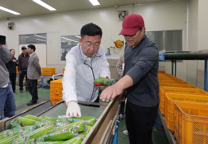 한방통신사 권영분기자 기자 | 이범석 청주시장은 20일 흥덕구 오송읍에 위치한 청원생명 애호박 공동선별장을 방문해 공선 및 유통 현황을 점검하고 관계자와 지역 농민들을 격려했다.