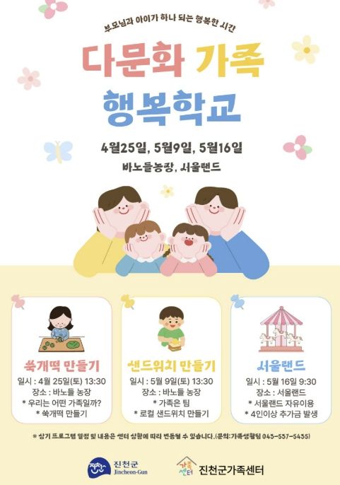 주요 내용으로는 진천 바노들농장에서 진행되는 부모·자녀 소통 교육과 농촌 체험 활동, 서울랜드에서의 문화체험, 가족 나들이 프로그램 등이 포함된다.