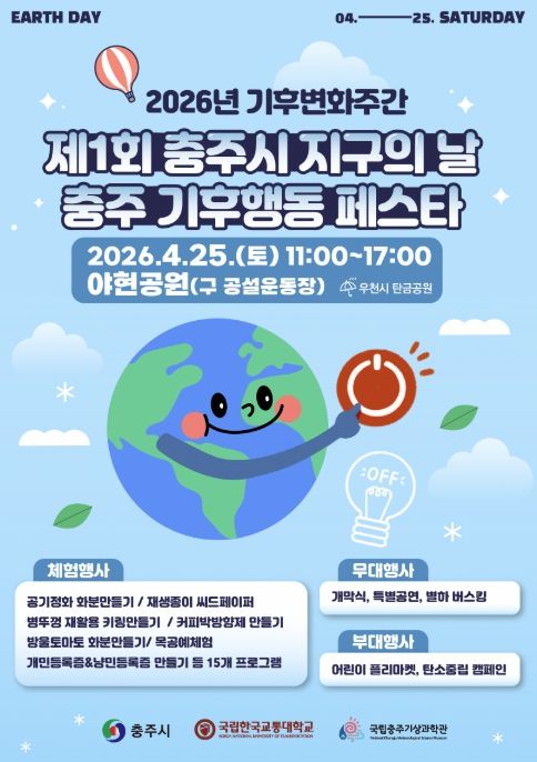 한방통신사 권영분기자 기자 | 충주시는 25일 오전 11시 야현공원(구 공설운동장) 일원에서 ‘2026년 기후변화주간’을 기념해 ‘제1회 충주시 지구의 날’ 행사를 개최한다고 21일 밝혔다.