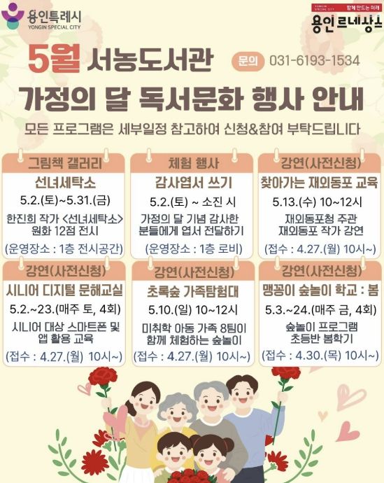 한방통신사 신유철기자 기자 | 용인특례시 서농도서관은 오는 5월 가정의 달을 맞아 다양한 세대를 아우르는 프로그램으로 이뤄진 ‘2026년 5월 독서문화행사’를 마련했다고 21일 밝혔다.
