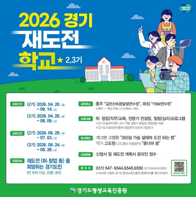한방통신사 신유철기자 기자 | 경기도와 경기도평생교육진흥원은 취업이나 창업 실패를 경험한 도민의 재기를 지원하기 위해 오는 20일부터 ‘2026년 경기 재도전학교’ 2~3기 참가자를 각각 55명 내외로 모집한다.