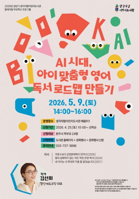 한방통신사 양호선기자 기자 | 원주시 생각자람어린이도서관은 다음 달 9일 오후 2시, ‘AI 시대, 아이 맞춤형 영어 독서 로드맵 만들기’를 주제로 5월 ‘함께자람 부모학교’ 프로그램을 운영한다.