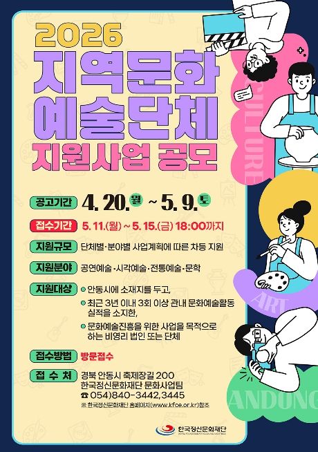 한방통신사 신유철기자 기자 | 안동시 한국정신문화재단은 5월 11일부터 5월 15일 18시까지 관내 문화예술단체를 대상으로 ‘지역문화예술단체 지원사업’ 참여단체를 공개 모집한다.