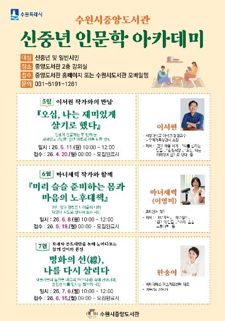 한방통신사 신유철기자 기자 | 수원시 중앙도서관이 5월부터 7월까지 매달 1회 운영하는 ‘신중년 인문학 아카데미’ 수강생을 모집한다.