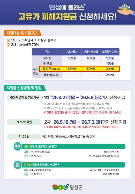 대상자 확인 등 추가 문의는 횡성군 고유가 지원금 콜센터 또는 각 읍·면 행정복지센터에서 가능하다.