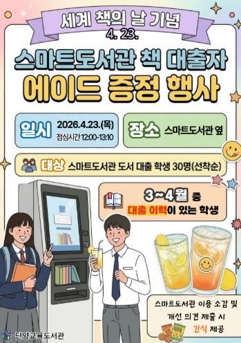 이번 행사에서는 3~4월 중 스마트도서관에서 책을 대출한 학생 선착순 30명을 대상으로 시원한 에이드 음료를 제공한다.