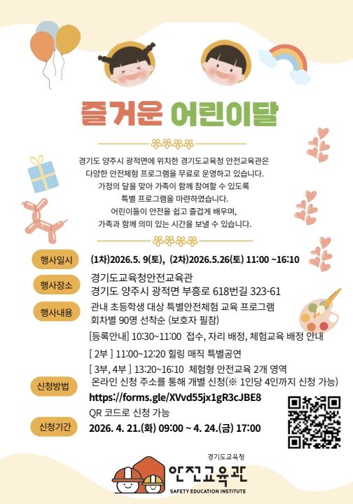 한방통신사 신유철기자 기자 | 경기도교육청안전교육관이 가정의 달을 맞아 가족이 함께 참여해 안전의 중요성을 쉽고 즐겁게 배울 수 있도록 ‘가정의 달 안전교육 특별 프로그램’을 운영한다.