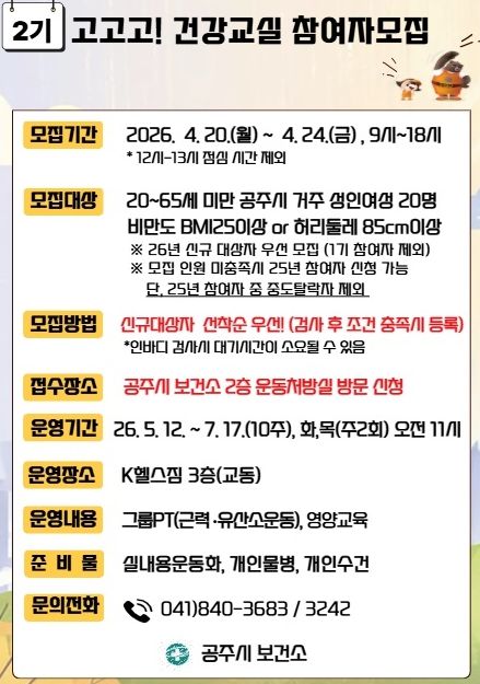 참여 신청은 4월 24일까지 공주시 보건소 2층 운동처방실을 방문해 선착순으로 접수하면 된다.
