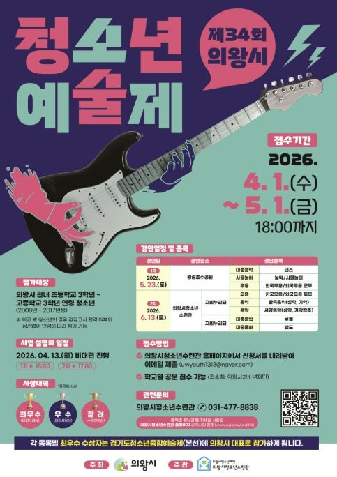 한방통신사 신유철기자 기자 | 의왕시청소년재단 산하 의왕시청소년수련관은 지역 청소년의 예술적 재능과 끼 발산의 장인 ‘제34회 의왕시청소년예술제’의 참가자를 5월 1일까지 모집한다고 밝혔다.