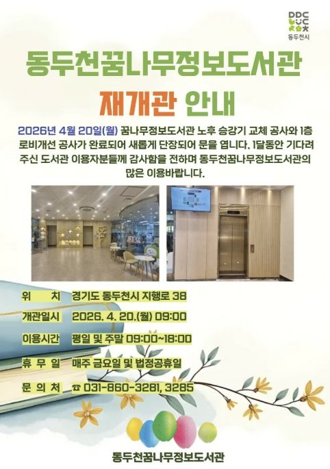 한방통신사 신유철기자 기자 | 동두천시 도서문화사업소 꿈나무정보도서관은 이용자 편의성과 안전성 강화를 위한 승강기 교체 공사와 1층 로비 환경개선 공사를 마치고 지난 4월 20일부터 재개관했다고 밝혔다.