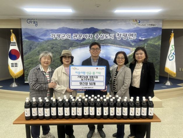 한방통신사 신유철기자 기자 | 가평군농협 청평지점 농가주부모임이 20일 지역 내 어려운 이웃을 위해 직접 만든 맛간장 50개를 청평면에 기탁했다.